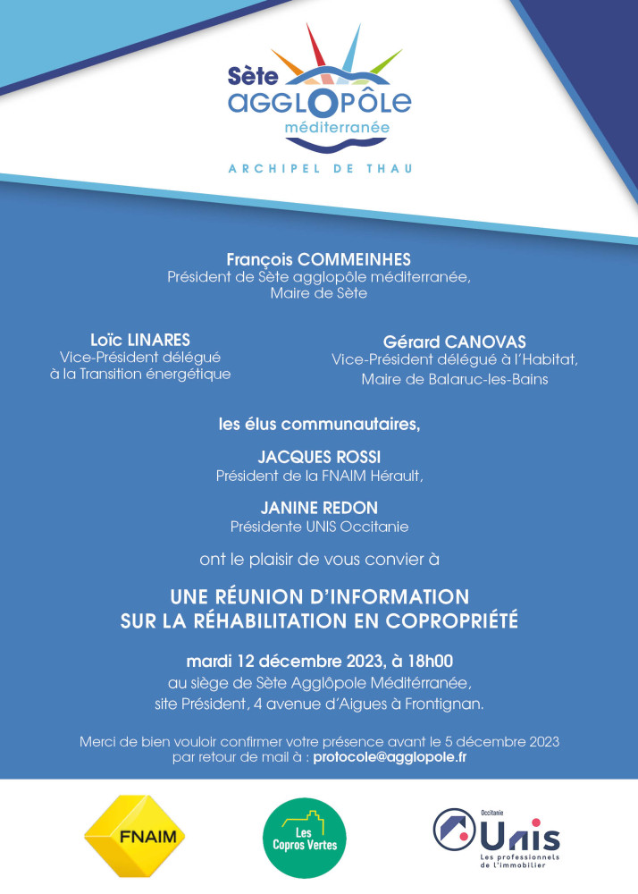 Le mardi 12 décembre 2023, à 18 h, au siège de l’Agglomération Méditerranée (Site Président, Frontignan) 📍 à une réunion d'information sur le thème :"La réhabilitation en copropriété"